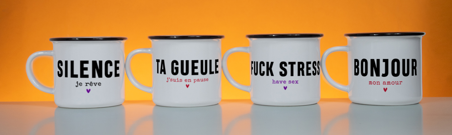 Commençons par les mugs, les tasses, appelez ça comme vous voulez. Nous avons à disposition des tasses en céramique, en métal émaillé ou en verre au choix. Il est possible de personnaliser un texte de votre choix dessus. Nous avons plusieurs typographies disponibles pour rédiger vos petits mots d’amour ou vos blagues. Nous avons même la possibilité d’imprimer avec diverses couleurs au choix sur les tasses en céramique et les tasses en métal émaillé. Les typographies ont divers styles que ce soit pour une citation ou des petits mots. Tous le monde y trouvera son compte. Du design simple et épuré, en passant par du décalé ou du drôle, tout est possible.