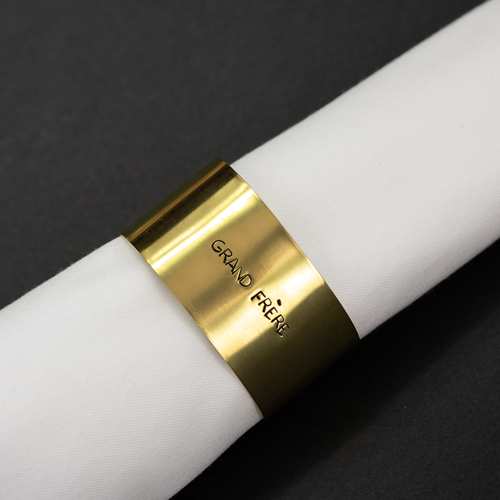 Ce rond de serviette doré est en laiton et façonné à la main par nos soins dans notre atelier. Les gravures sont réalisées lettre à lettre, à la main, avec amour.