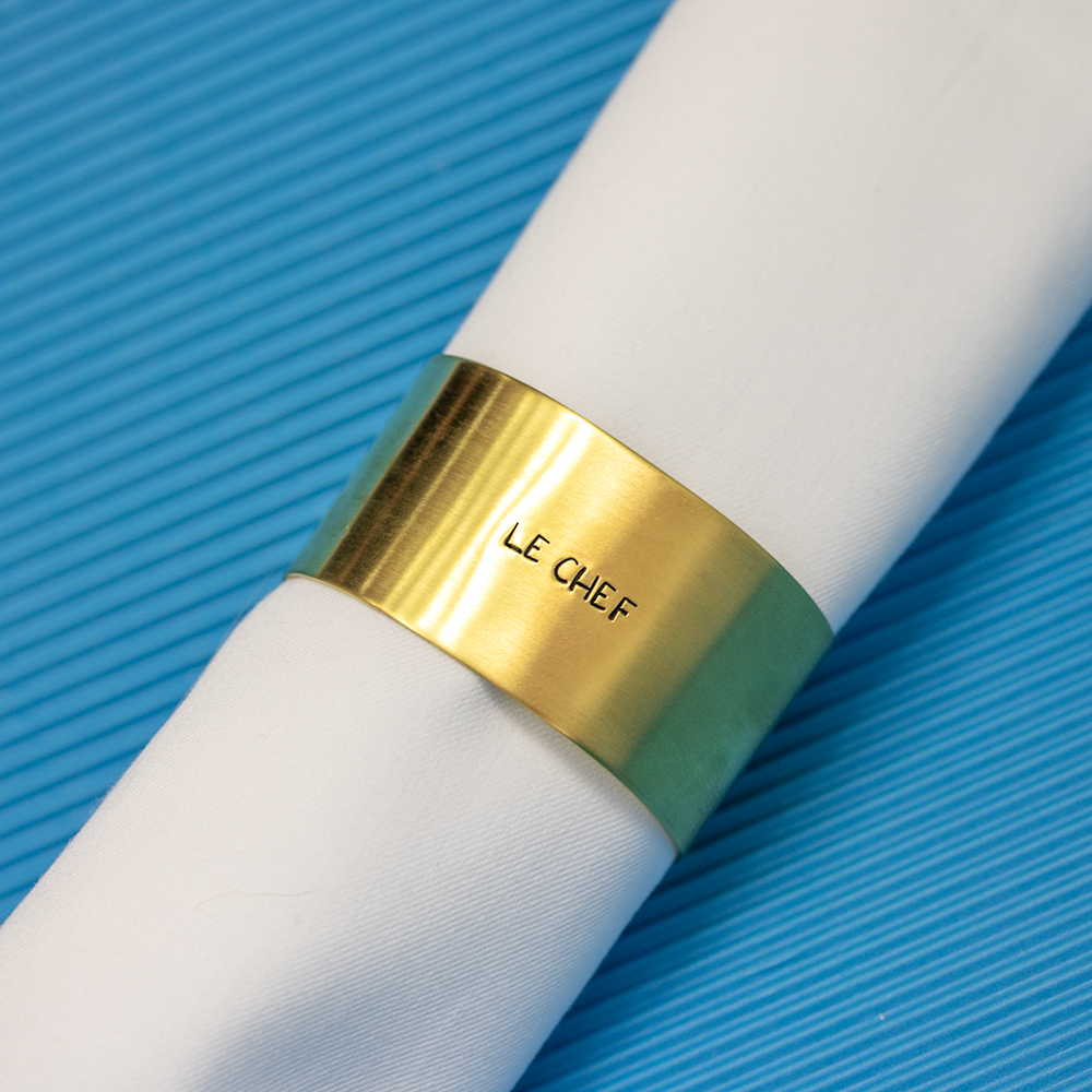 Ce rond de serviette doré est en laiton et façonné à la main par nos soins dans notre atelier. Les gravures sont réalisées lettre à lettre, à la main, avec amour.