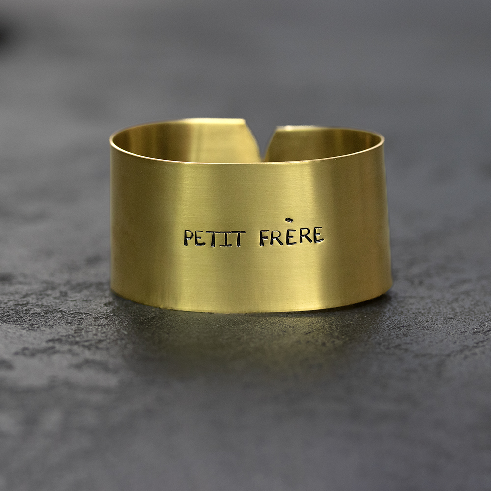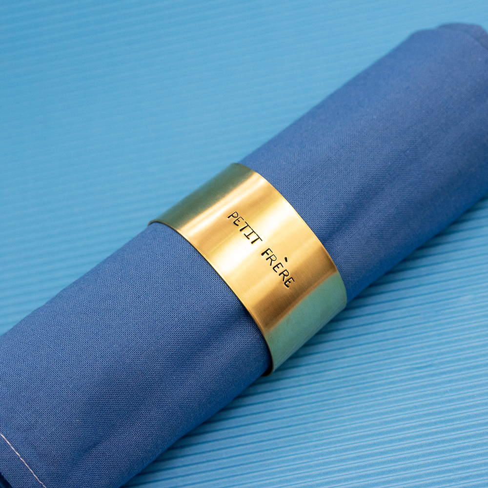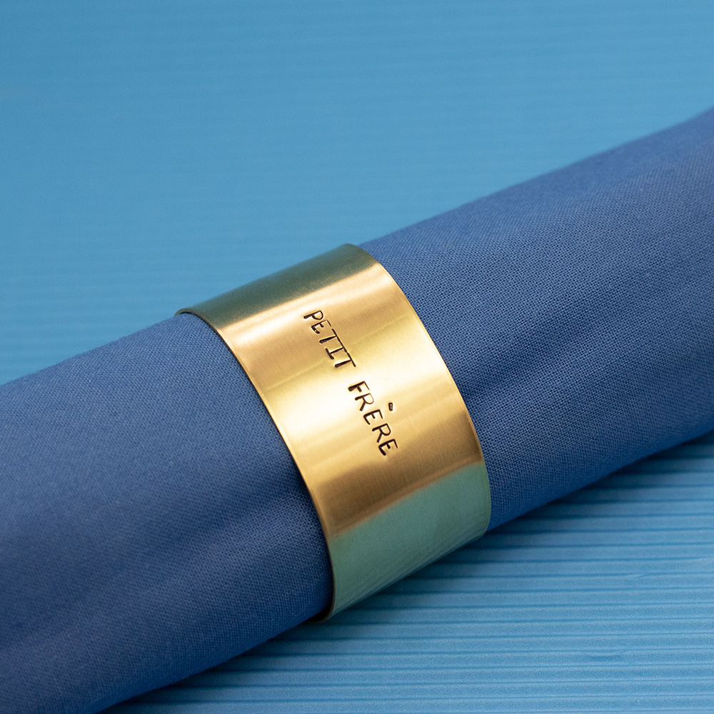 Ce rond de serviette doré est en laiton et façonné à la main par nos soins dans notre atelier. Les gravures sont réalisées lettre à lettre, à la main, avec amour.